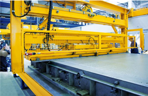 为了最充分利用车间面积和空间,底模托盘叠放在养护室内的搁架上。堆垛机把托盘运送到养护所需的架层,推进养护室;养护结束后再拉出养护室。根据生产线的设计,可以配备不同类型的堆垛机,以适应不同的需求。养护室也可以选配相应的供热系统。